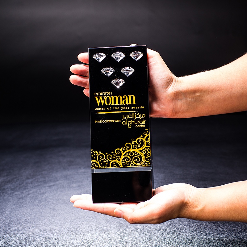 The Amelia Award is a self standing wedge shape manufactured from a combination of Black and Clear Optic Crystal. Six small half diamonds in Clear Optic Crystal are seamlessly bonded making this award an “eye catcher”