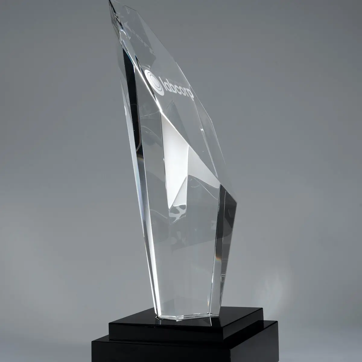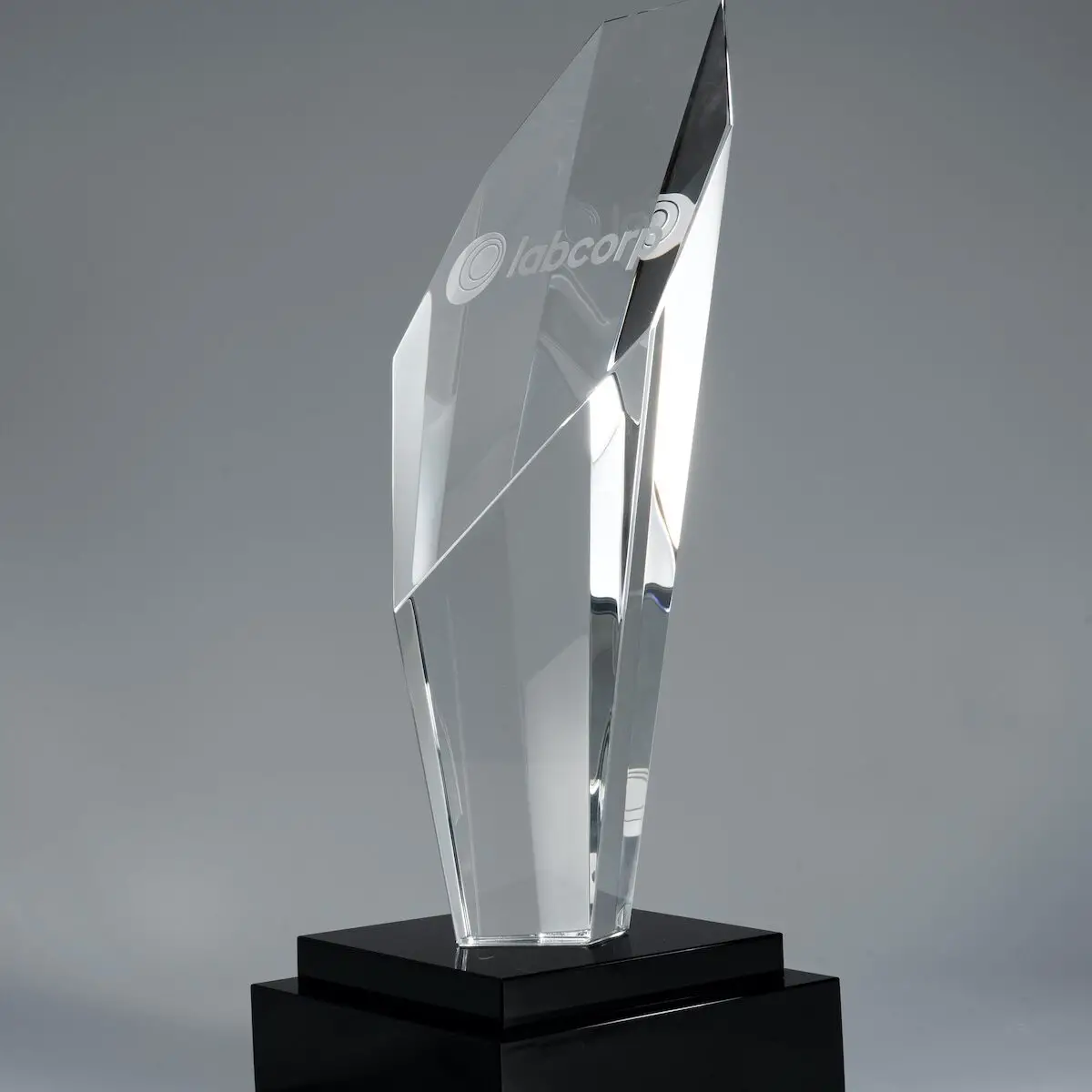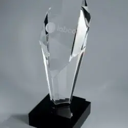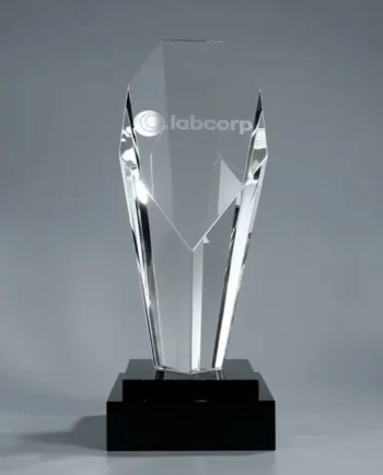 The Carrington Tower is a large custom Award has multiple bevels on the reverse side that reflect light in all directions. Manufactured from premium quality K9 Clear Optic Crystal and attached to a double layer Black Optic Crystal Base, the Carrington Tower with it's extra large diamond shaped engraving surface is an eye catcher. Each Carrington Tower is meticulously hand finished and polished to perfection. At an impressive 18” tall this Award is sure to turn heads. It comes packaged in a premium quality black satin lined presentation box. It is available as a blank for engravers, or if you prefer we can do the engraving for you.