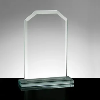 The Gemini clipped rectangle is an economy priced award manufactured from 10mm (3/8”) thick Jade Glass and is attached to a 12mm (1/2”) Jade Glass base. This classic award is beveled to reflect light in any direction. It is