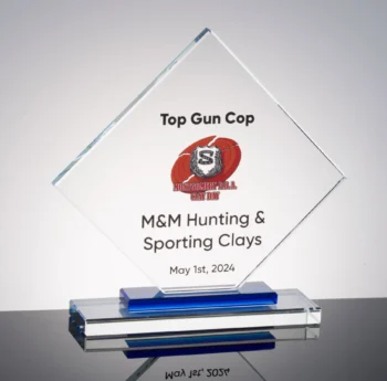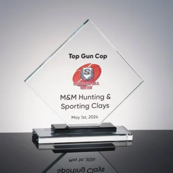 The Gemini Clipped Square is an economy priced award manufactured from 12mm (1/2”) thick Crystal Clear Glass and is attached to a double tiered Crystal Clear base and a Blue/ Black base. This classic square award is clipped and mounted diagonally as a diamond shape. It is available in two sizes. The Gemini Award Series is perfect for abrasive etching, Co2 surface laser engraving, sub surface laser engraving, and is an excellent candidate for UV full color printing. This series is sold as a blank product, or if you prefer we can do the engraving or printing for you. Insta Crystal ships all over USA.