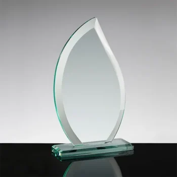 The Gemini Flame is an economy priced award manufactured from 10mm (3/8”) thick Jade Glass and is attached to a 12mm (1/2”) Jade Glass base. This classic flame award is beveled to reflect light in any direction. It is available in two sizes. The Gemini Award Series is perfect for abrasive etching, CO2 surface laser engraving, sub surface laser engraving, and is an excellent candidate for UV full color printing. This series is sold as a blank product, or if you prefer we can do the engraving or printing for you.