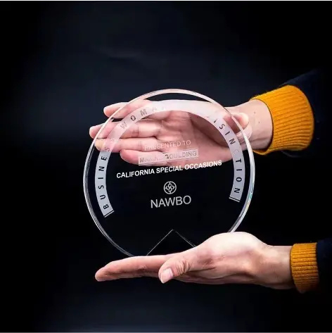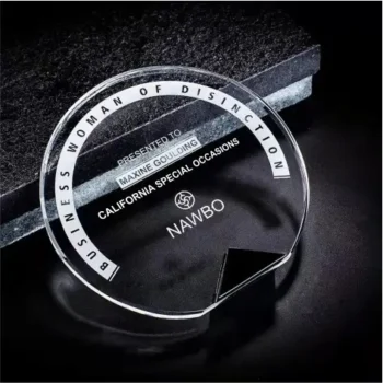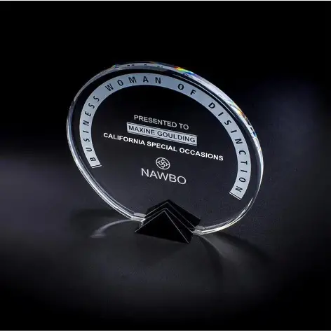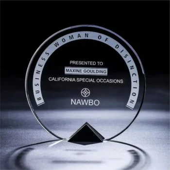 The Selena Award features a highly polished clear Optic Crystal Circle. At the bottom of the Circle is a flat surface with a black Optic Crystal Triangle bonded to form a base for the Selena Award. It is available in two sizes (5" and 7" diameters). The Selena Awards come in a premium quality presentation box.
